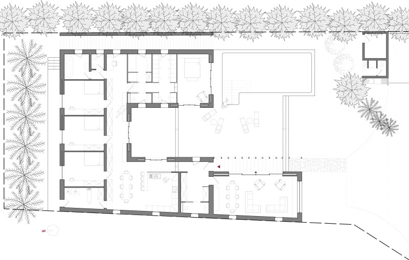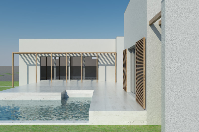 Il s'agit d'une villa de 200 m² pour une famille composée d'un couple et de ses 4 enfants. Le terrain de 1000 m² forme un rectangle orienté Nord/Sud. En respectant les contraintes urbanistiques, l'idée a été d'articuler la villa en U autour d'une cour centrale sur laquelle donnent les espaces principaux. Par la même occasion, l'habitation tourne le dos aux parcelles voisines et s’ouvre vers le sud pour bénéficier d'une lumière tout au long de la journée ainsi que d'une certaine intimité. Les deux niveaux du sol à 50 cm et 80 cm permettent encore une fois d'articuler les espaces également en hauteur tout en garantissant un vide-sanitaire réglementaire pour cette zone inondable.