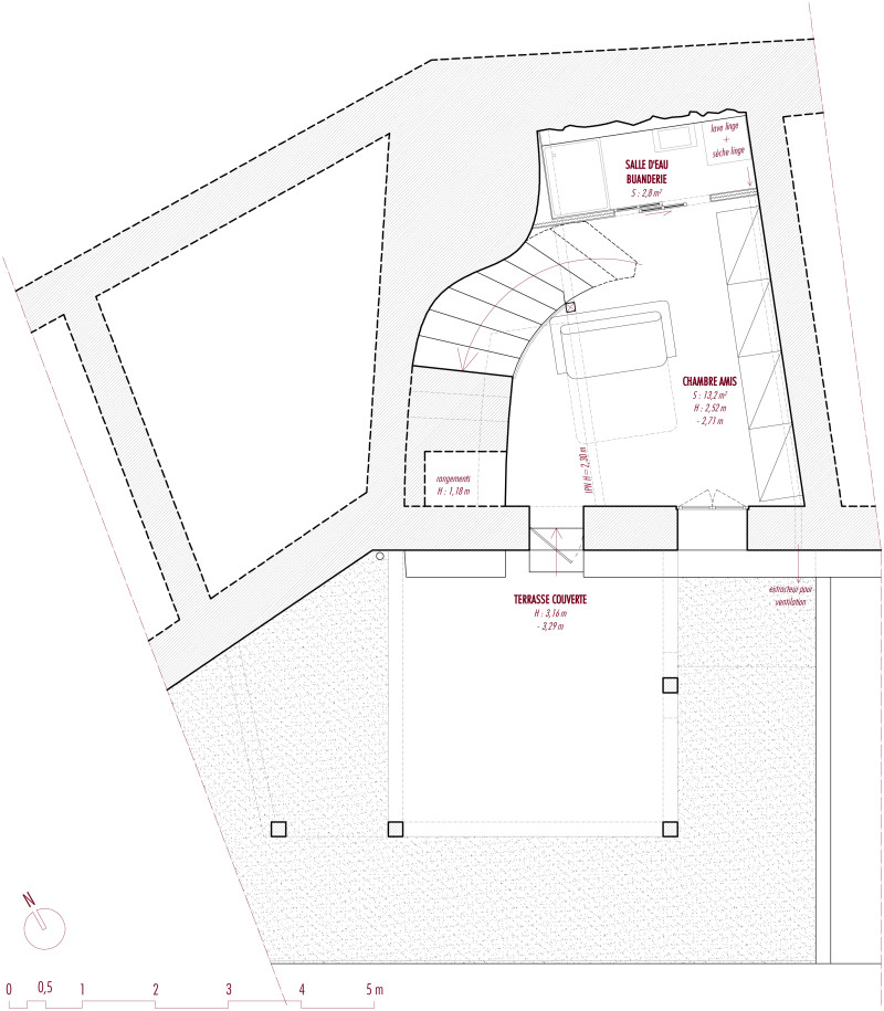 Les 3 niveaux de la maison ont des rapports particuliers à leur contexte et tous ont été traités de manière différente.
