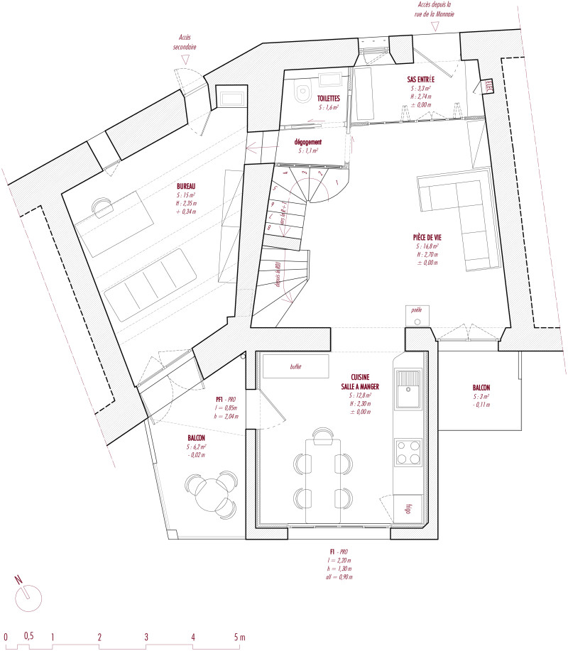 Le projet a consisté dans le positionnement de l'escalier et l'aménagement de chaque espace en s'adaptant à la structure pour résoudre tous les disfonctionnements internes.