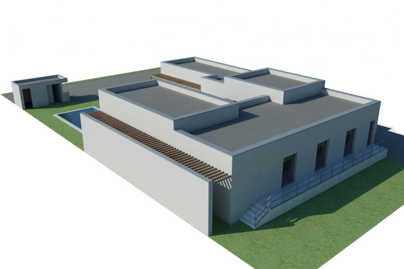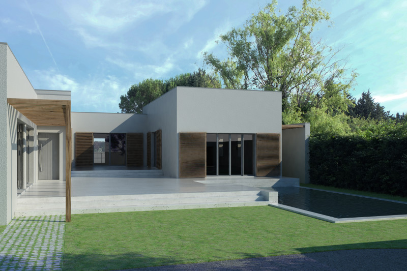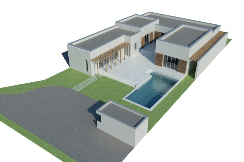 Il s'agit d'une villa de 200 m² pour une famille composée d'un couple et de ses 4 enfants. Le terrain de 1000 m² forme un rectangle orienté Nord/Sud. En respectant les contraintes urbanistiques, l'idée a été d'articuler la villa en U autour d'une cour centrale sur laquelle donnent les espaces principaux. Par la même occasion, l'habitation tourne le dos aux parcelles voisines et s’ouvre vers le sud pour bénéficier d'une lumière tout au long de la journée ainsi que d'une certaine intimité. Les deux niveaux du sol à 50 cm et 80 cm permettent encore une fois d'articuler les espaces également en hauteur tout en garantissant un vide-sanitaire réglementaire pour cette zone inondable.